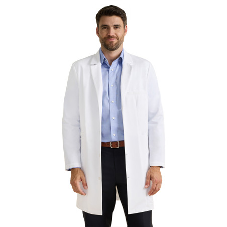 Bata para caballero Healing Hands estilo moderno, cuenta con 4 botones frontales, aberturas laterales y con 7  bolsillos, bolsillos delanteros, para el celular, bolsillo interior, bolsillo con cierre y bolsillo de ribete en el pecho.